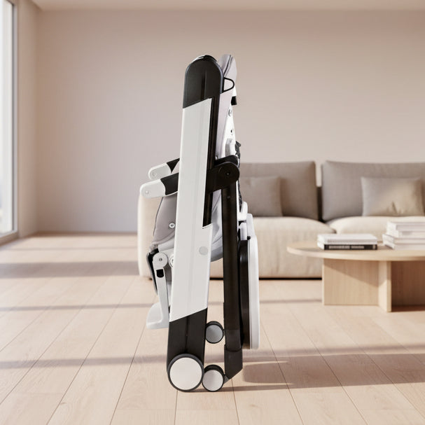 8. 獨有STOP & GO 鎖掣系統,按下即可移動椅子,放開即可鎖緊底輪,固定餐椅於適合地方使用